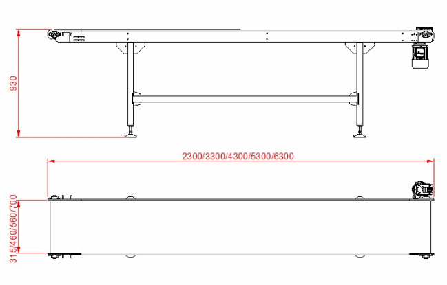 Das Band wird über die ganze Länge seitlich geführt. Es können auch überstehende Trays und Töpfe transportiert werden, da kein Bauteil über dem Band angebracht ist. Die Band-Geschwindigkeit ist elektronisch regelbar.