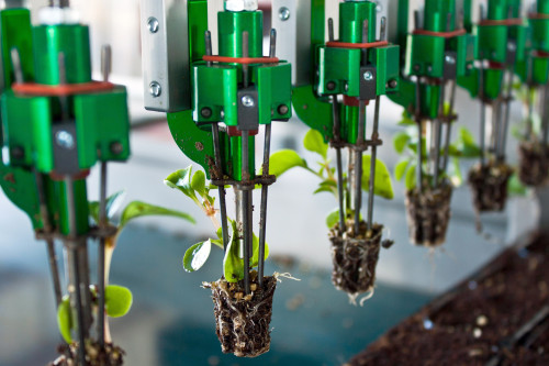 Die Jungpflanzen werden mittels der bis zu 10 motorisierten Pflanzgreifer von Trays in Töpfe, Schalen und Kisten umgepflanzt.