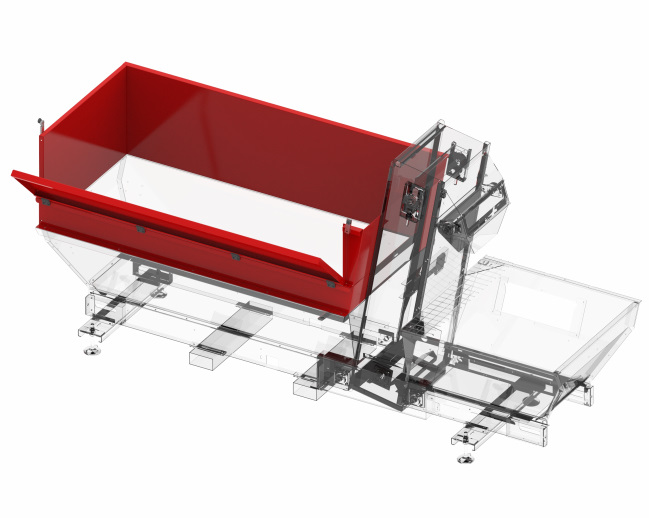 Die überschüssige Erde, die am Topf vorbei fällt, wird durch ein Transportband wieder zum 1000-Liter-Erdbunker zurückgeführt. Weiter wird der Topf durch einen rotierenden Abstreifer zur Bohrstation geleitet, wo mittig ein Loch in die Erde gebohrt wird. Zum Pflanzen von nicht getopfter Ware wird der Abstreifer, der Bohrer und die Verkleidung abgenommen (Zeitaufwand ca. 10 min.).