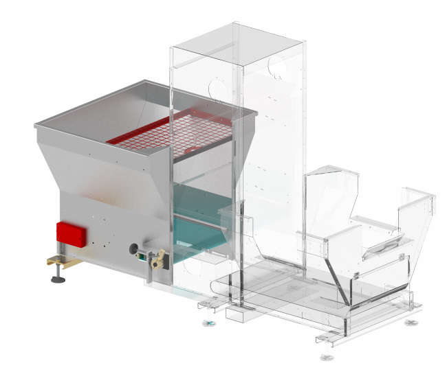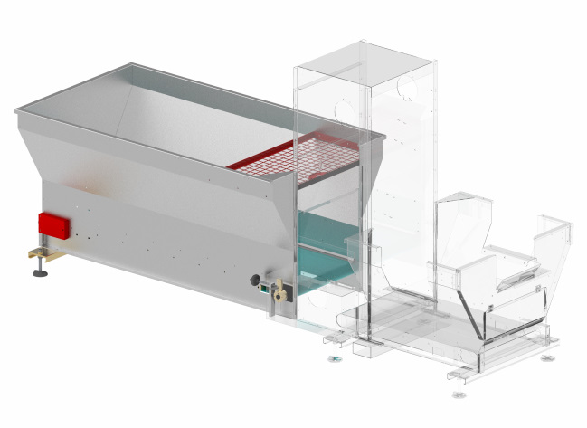 Das elektronisch gesteuerte Rüttelwerk unter dem Transportband dient zur gleichmäßigen Befüllung der Töpfe.