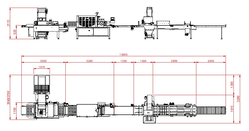 Produktionslinie mit Trayfüllmaschine RC1200, mitlaufender Stanze, Walzensägerät R30, Abstreuer mit Bunker, Bewässerung und Aufstapelung