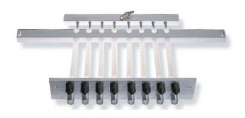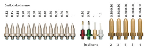 Die Säeinrichtung wird für das jeweilige Tray angefertigt und besteht aus einer Düsenschiene, einer Trichterschiene und einer Vorstanze.